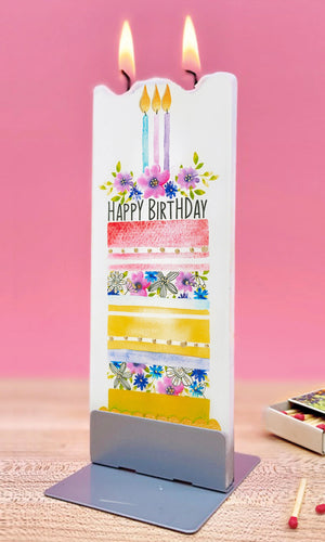 Torta di buon compleanno - candela artigianale piatta dipinta a mano con una colorata torta di compleanno: un’idea regalo originale per festeggiare in modo unico e decorare la casa con allegria.
