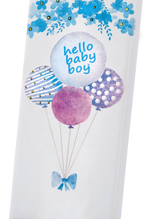 Candela artigianale piatta Benvenuto piccino, dipinta a mano con dolci tonalità celeste: un’idea regalo speciale per celebrare la nascita di un bambino con eleganza e tenerezza.