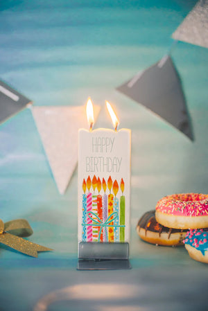 Candela artigianale piatta dipinta a mano con una colorata torta di compleanno: un’idea regalo originale per festeggiare in modo unico e decorare la casa con allegria.